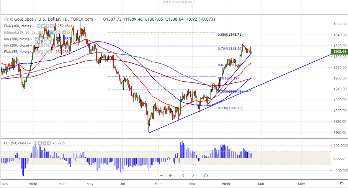 Gold has lost more than $10 after a sharp jump till $1318 after better than expected U.S CPI data. US CPI came unchanged at 0.0% compared to -0.1% previous month and core CPI rose 2.2% in Jan compared to forecast of 2.1%. The yellow metal hits low of $1305.13 and is currently tracing around $1308.92. Gold was one the best performer in Jan and has jumped more than $50 on account of dovish Fed and global uncertainty.