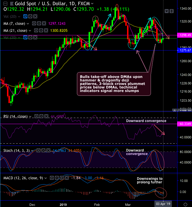 Gold’s (XAUUSD price) has plummeted below 7 & 21-DMAs after 3-black crow pattern at $1,290.14 levels. Failure swings were observed at peaks of $1,346.61 levels.