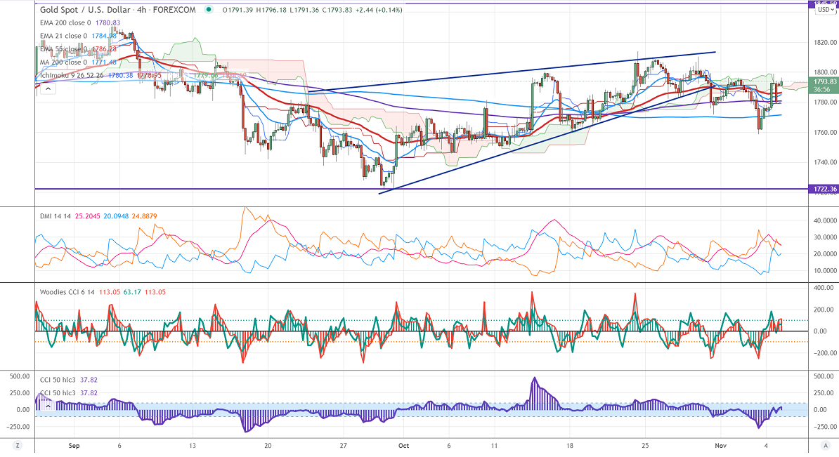 Gold recovered more than $30 from yesterday's low of $1761. Markets eye US non-farm payroll for further direction. The yellow metal gained after Fed said that inflation is transitory and no rush to raise interest rates. It has regained sharply above 94 levels and any surge past 94.50 confirms further bullishness. Gold hits an intraday low of $1779.54 and is currently trading around $1793.50.