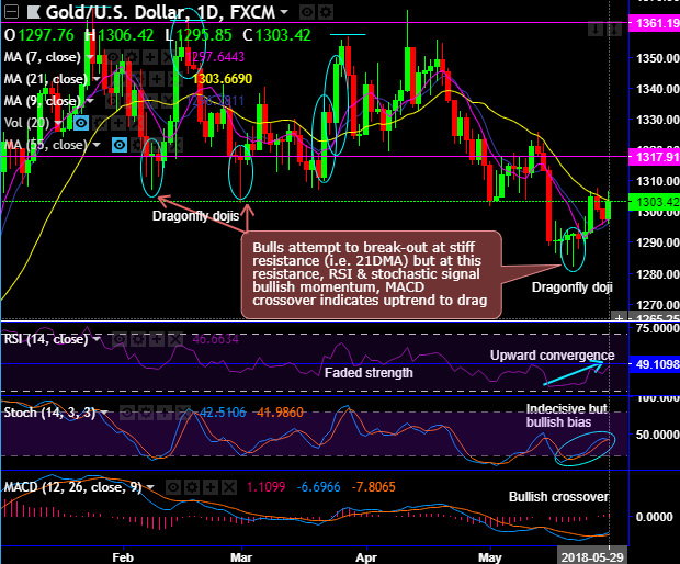 The intermediate trend has been stuck in the tight range between $1,368.20 and $1,300.89 levels. To counter downswings, the hammer pattern has occurred at $1314.88 to intensify rallies.
