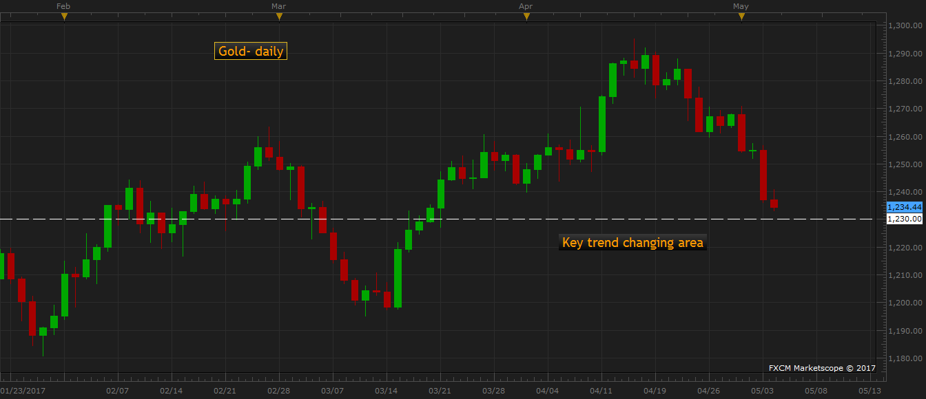 Gold is now testing a very key short-term trend changing level which is around $1230 area.