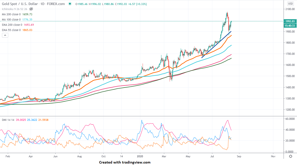 The yellow metal surged more than $100 from the minor bottom and hits a high of $1995. It is currently trading around $1992.
