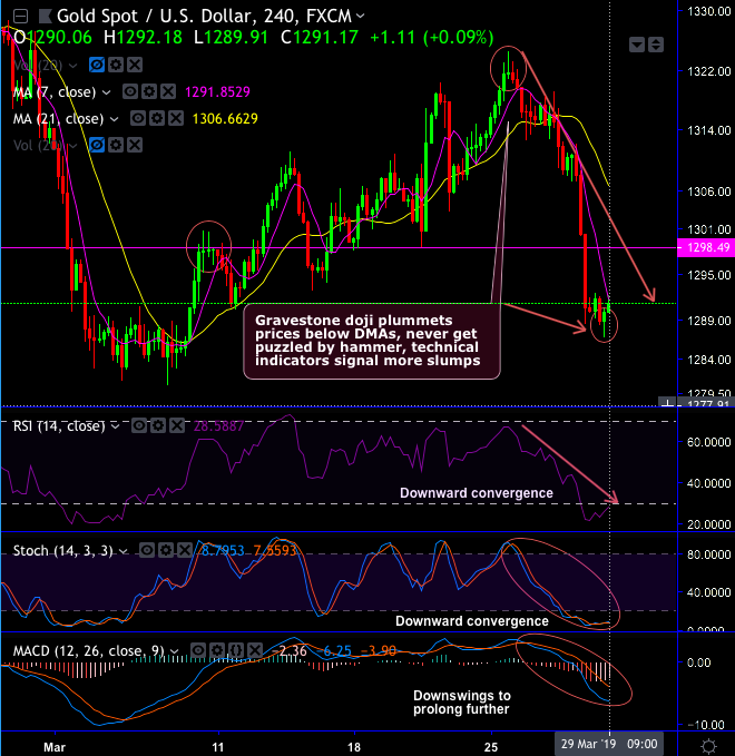 However, it has continued to sense buying sentiments after today’s hammer formation at $1,290.06 levels (on the 4H chart). There is no support from technical indicators as you could observe both RSI & stochastic curves show downward convergence constantly to the steep price dips to indicate selling momentum.