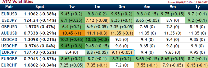 Rationale: With above range bounded trend being anticipated, more importantly, as you can see from the nutshell the pair is likely to perceive gradually picking up from1- months maturities, thus we recommend deploying call ratio spreads suitable for prevailing circumstances.