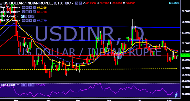 We prefer to take long position in USD/INR only above 67.05, stop loss at 66.62 and target of 67.32/67.48.