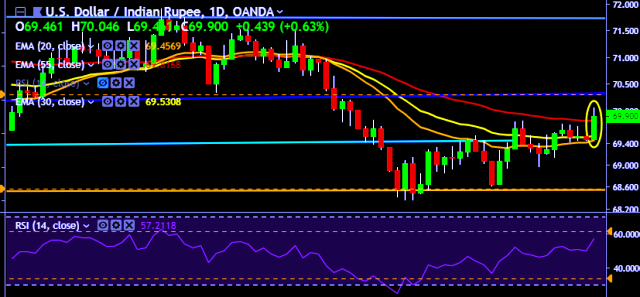 - USD/INR is currently trading around 69.90 marks.