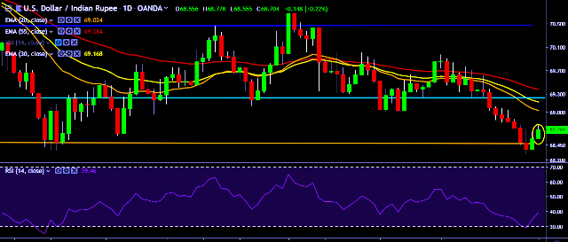 We prefer to take long position on USD/INR around 68.70, stop loss 68.55 and target of 69.10/69.38.