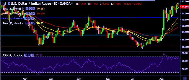 We prefer to take long position on USD/INR only above 71.75, stop loss 71.50 and target of 72.23.