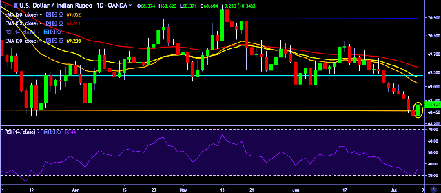 - USD/INR is currently trading around 68.60 marks.