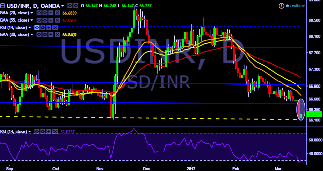 We prefer to take short position in USD/INR around 66.30, stop loss at 66.48 and target of 65.95.