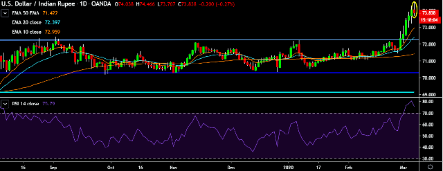 - It made intraday high at 74.46 and low at 73.70 marks.