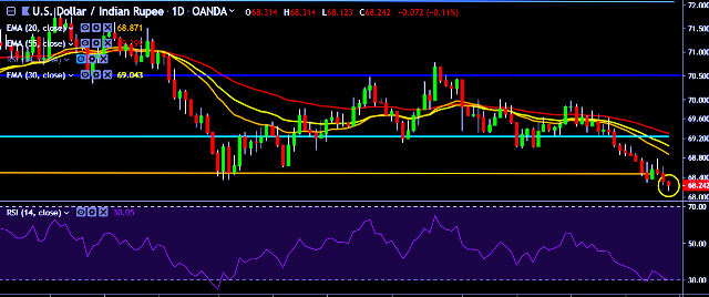 - USD/INR is currently trading around 68.22 marks.