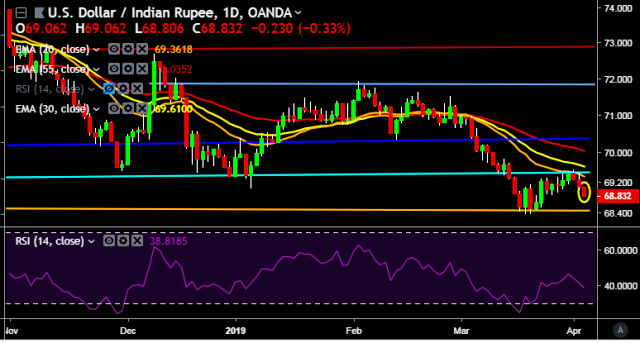 We prefer to take short position on USD/INR around 68.94, stop loss 69.10 and target of 68.53/68.34.