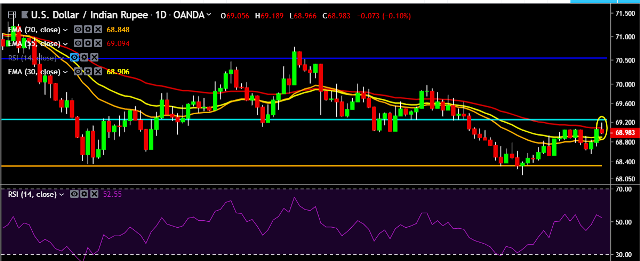 - USD/INR is currently trading around 68.98 marks.