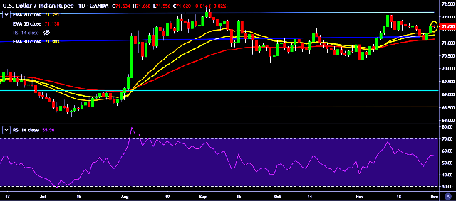 - USD/INR is currently trading around 71.58 marks.