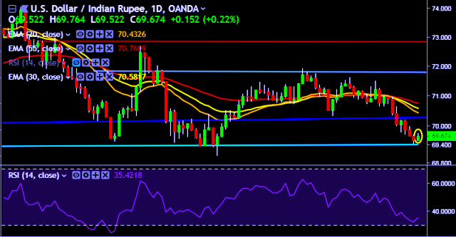 - USD/INR is currently trading around 69.67 marks.