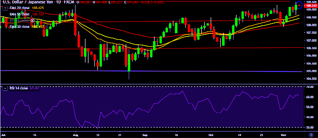 - USD/JPY is currently trading around 109.23 marks.
