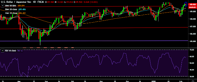 - USD/JPY is currently trading around 109.90 marks.