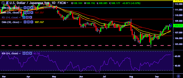 - It made intraday high at 108.21 and low at 108.08 levels.