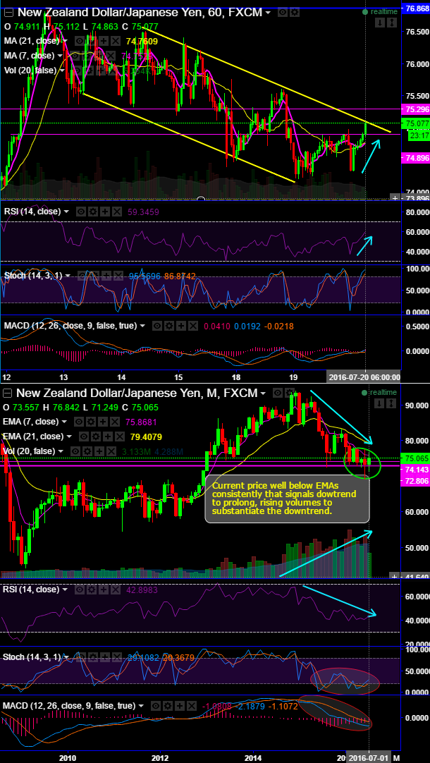As a result, the Kiwi currency crosses have gained, NDJPY rallied from 74.322 to the current 74.943 levels, that's where it has jumped above DMAs on intraday charts.