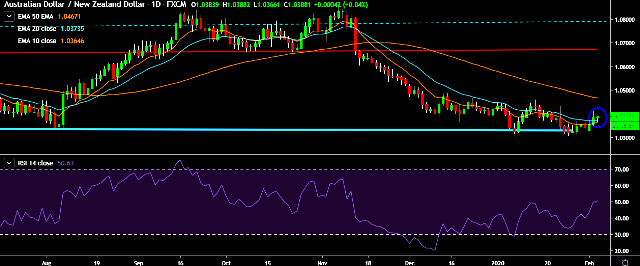 - AUD/NZD is currently trading around 1.0389 marks.