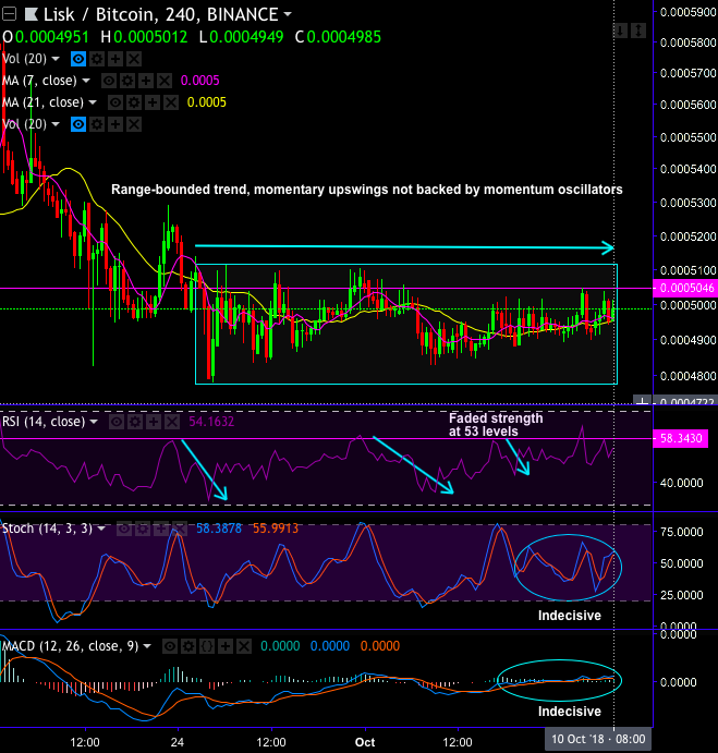 Per time of articulating this write-up, LSKBTC price has been attempting to spike higher for the day at current 0.0005018 levels, but the Lisk price trend is restrined within the tight range (refer rectangular area on 4H chart).