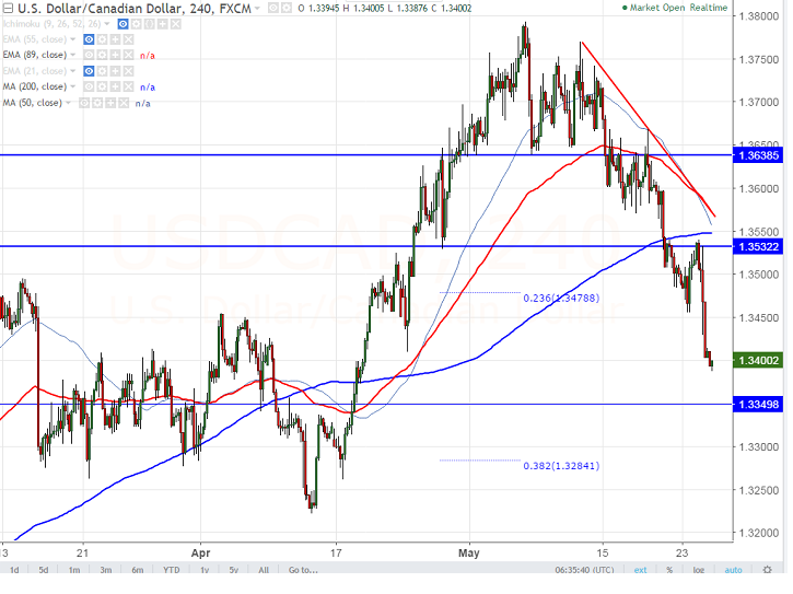 - USD/CAD hits fresh 1- month low on account of optimistic Bank of Canada statement and rising oil prices. Short term trend is still weak as long as resistance 1.3548 (200 4H EMA) holds. It is currently trading around 1.33966.