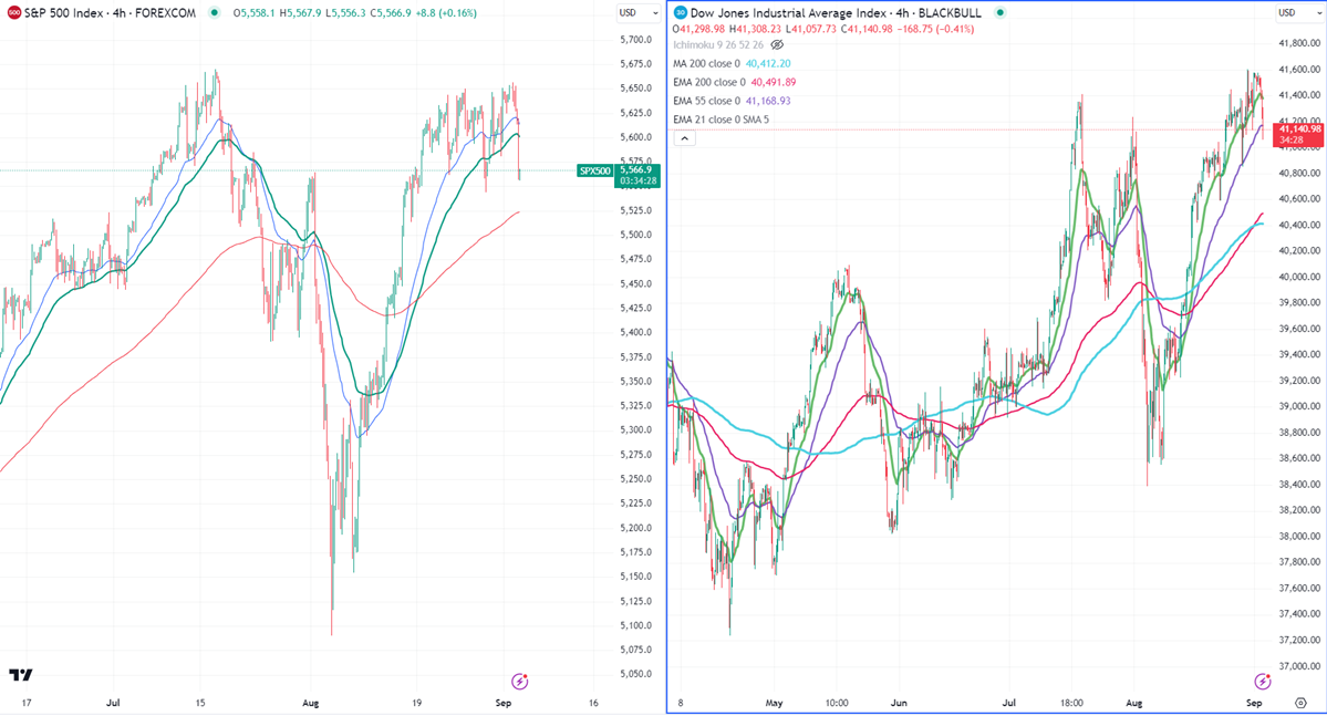The pair hold above short-term (34, 55 EMA) and long-term (200 EMA) in a 4-hour chart.