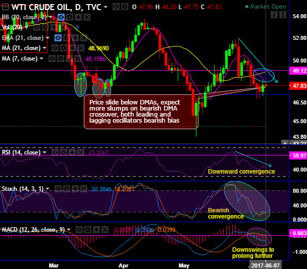 The shooting star occurred at 51.27 levels, consequently, the price slides below DMAs, for now, we expect more slumps on bearish DMA crossover, both leading and lagging oscillators have been bearish bias (refer daily charts).