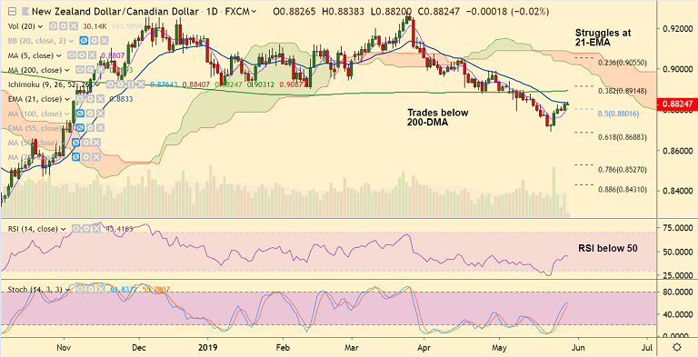 Break above 21-EMA required for further upside. Next bull target lies at 200-DMA at 0.8893.