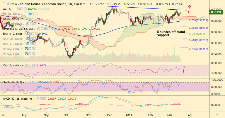 - NZD/CAD has bounced off cloud support, is extending gains for the 2nd straight session.