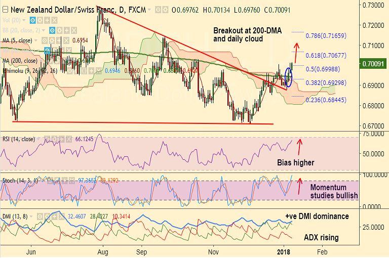 - NZD/CHF is extending breakout at 200-DMA and daily Ichi cloud last week, bias higher.
