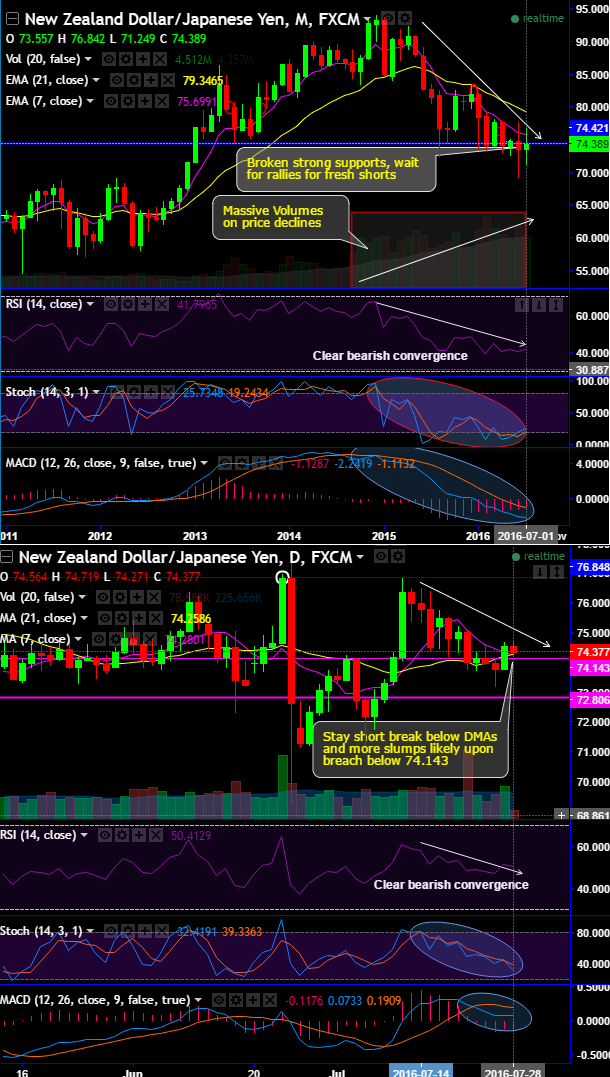 1w NZDJPY ATM IVs are spiking at 24.50%, risk averse bears should wait for the breach of above-mentioned support levels to initiate fresh shorts, alternatively, the trade strategy for aggressive speculators would be the cash-or-nothing binary options using boundary binaries on an intraday speculation basis.