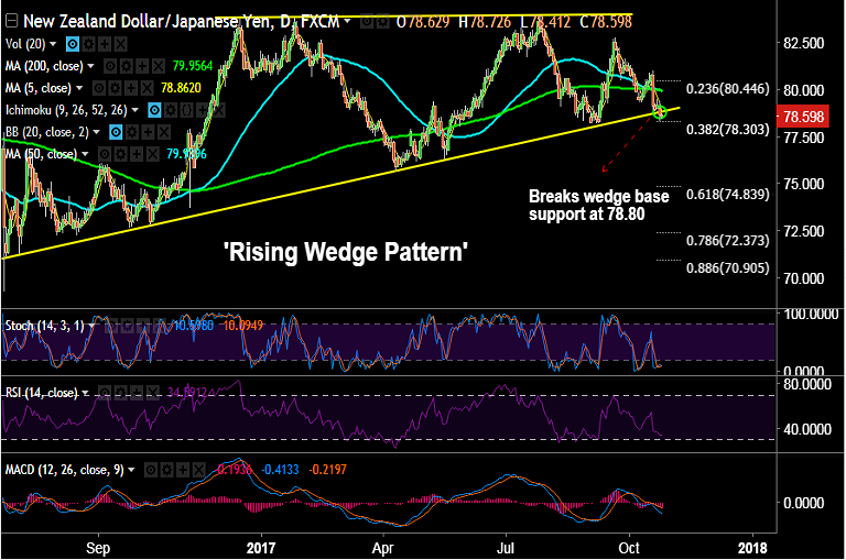 - NZD/JPY is trading in a rising Wedge pattern, and has broken strong support at Wedge base at 78.80.