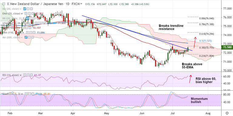 NZD/JPY trades 0.54% higher on the day at 72.58 at 07:25 GMT, bias higher.