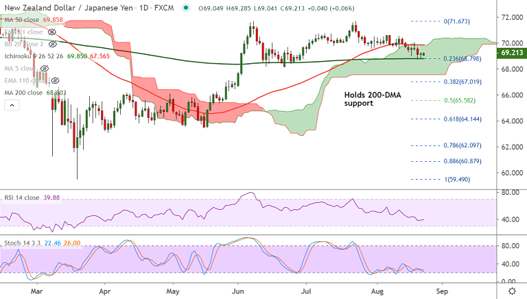 The pair is extending bounce off 200-DMA support and weakness only on break below.