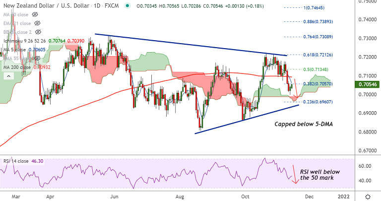 Summary: NZD/USD was trading with a bearish bias. 5-DMA caps upside at 0.7060, decisive break above could change near-term dynamics.