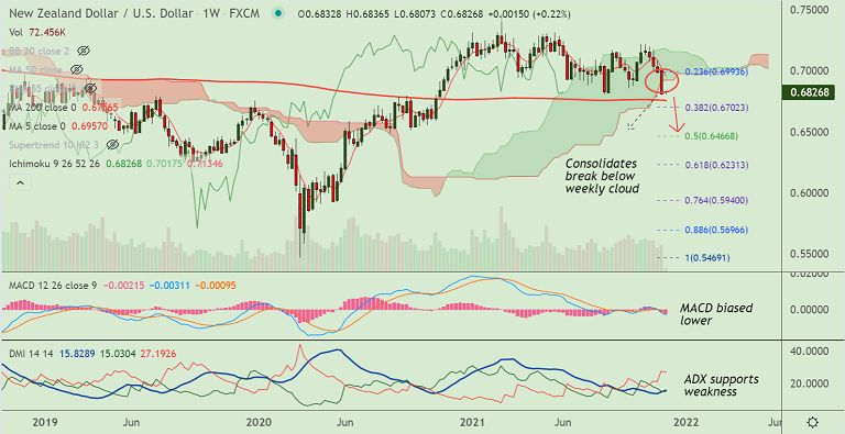 Summary: NZD/USD trades with a major bearish bias. Break below weekly cloud has opened downside. Scope for dip till 200-week MA.