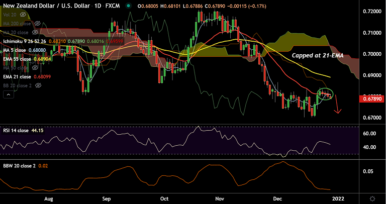 Summary: NZD/USD was trading with a bearish technical bias. Failure of bulls to take price above 21-EMA has reinforced bearish bias. Resumption on weakness likely below 20-DMA. Scope for test of 200-week MA at 0.6745.