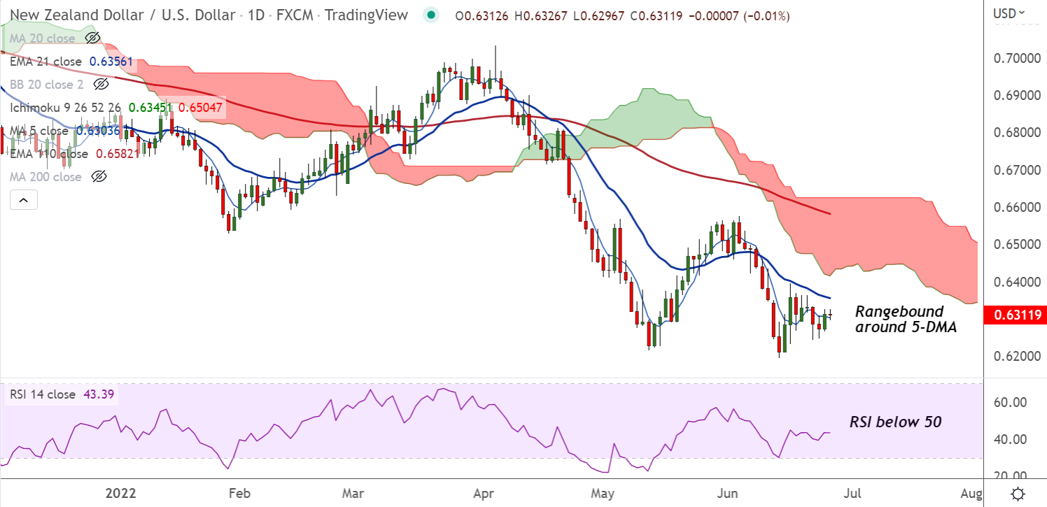 Summary: NZD/USD comatose around 5-DMA. Major trend is bearish. That said, watch out for retrace above 21-EMA for further upside.