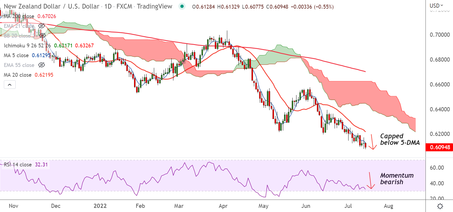 Summary: NZD/USD was trading with a strong bearish bias. The pair has hit fresh 2-year lows at 0.6077, scope for further weakness.