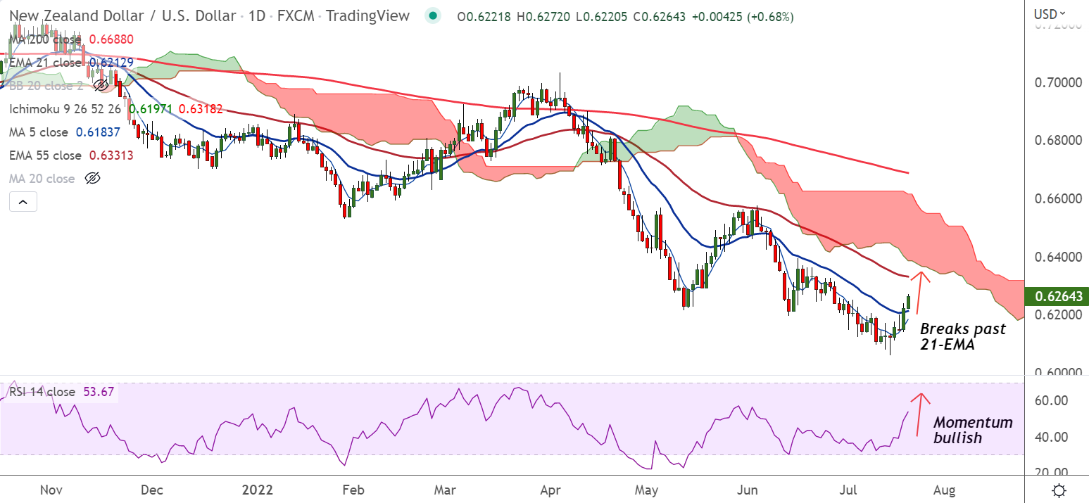 Summary: NZD/USD trades with a bullish bias. Scope for test of 55-EMA at 0.6331.