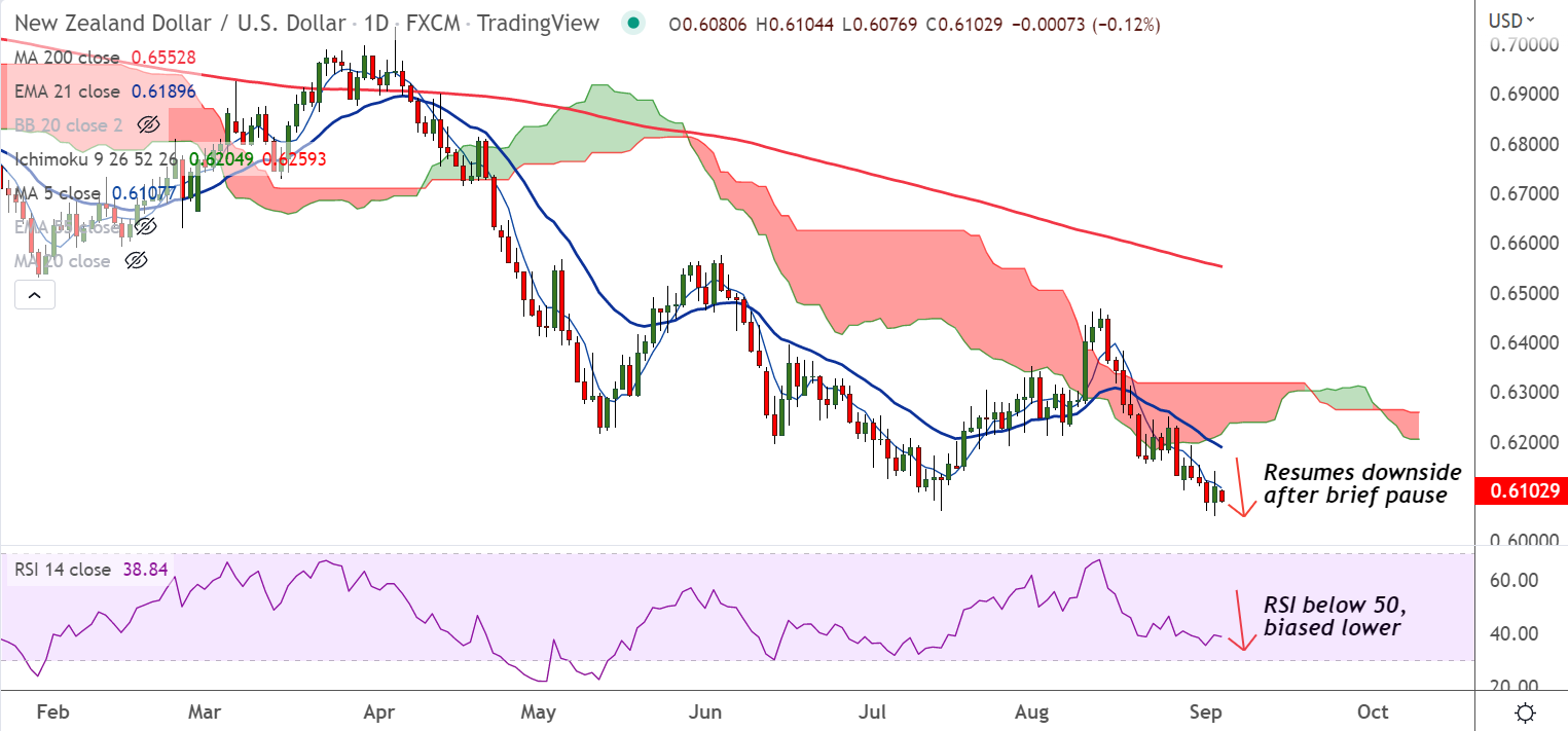 Summary: NZD/USD trades with a bearish bias. The pair is poised to extend weakness. Scope for break below 0.60 levels.