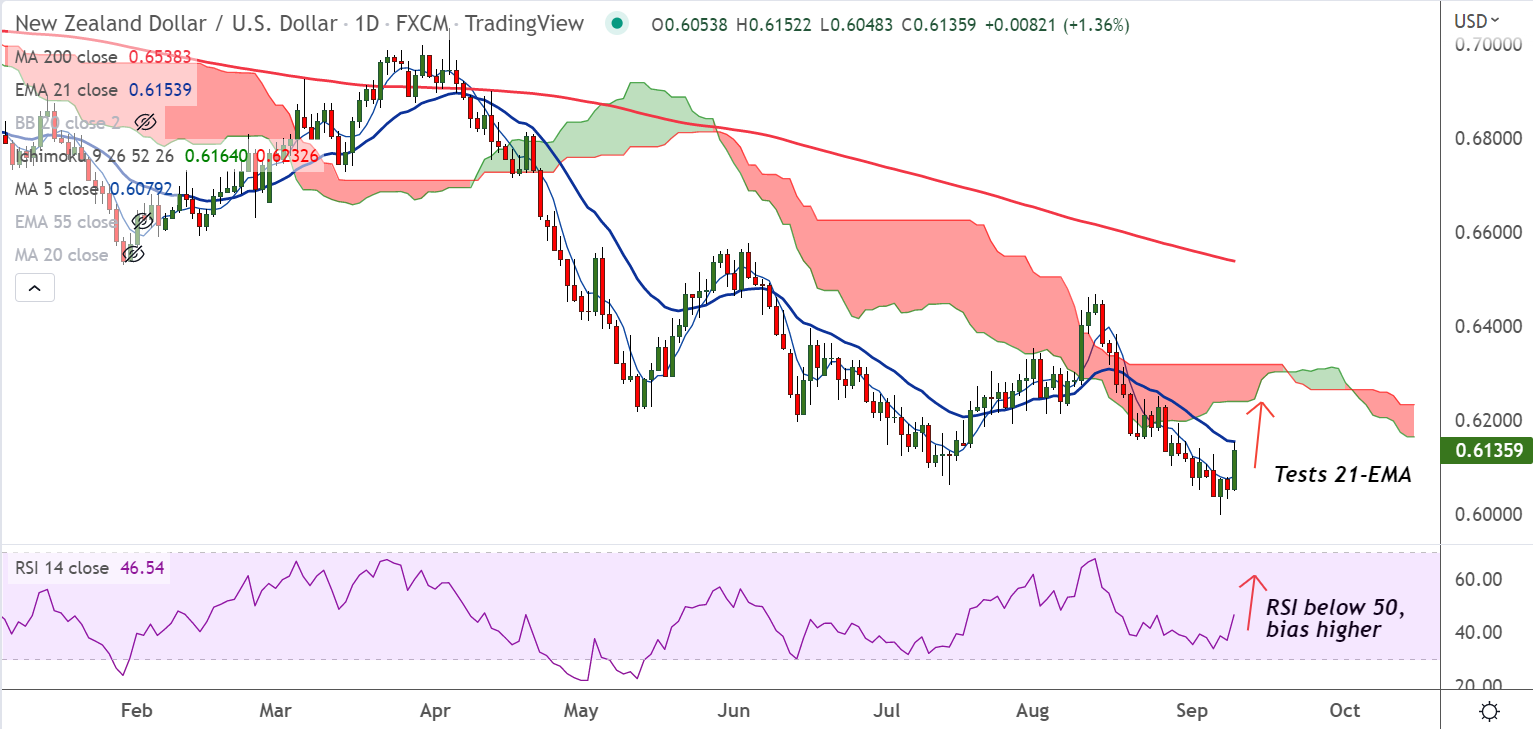 Summary: NZD/USD testing 21-EMA resistance, decisive break above will propel the pair higher.