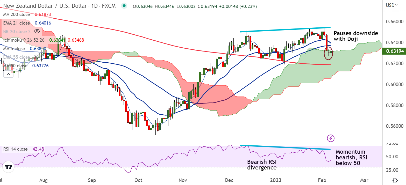 NZD/USD trades with a bearish bias. Scope for more downside. Decisive break above daily cloud will change near-term dynamics.