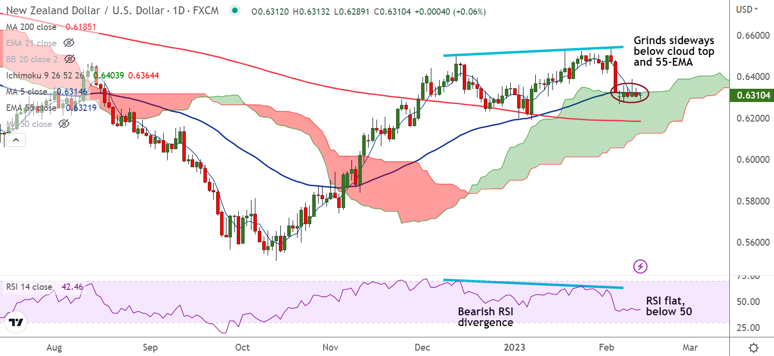 - NZD/USD hovers around 55-EMA and cloud top