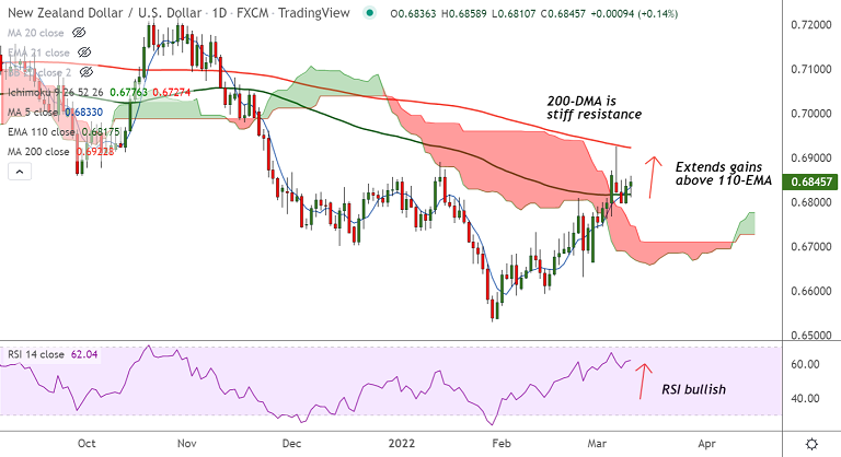 Technical indicators support gains in the pair. Weakness only below 110-EMA. Resumption of upside will see test of 200-DMA.