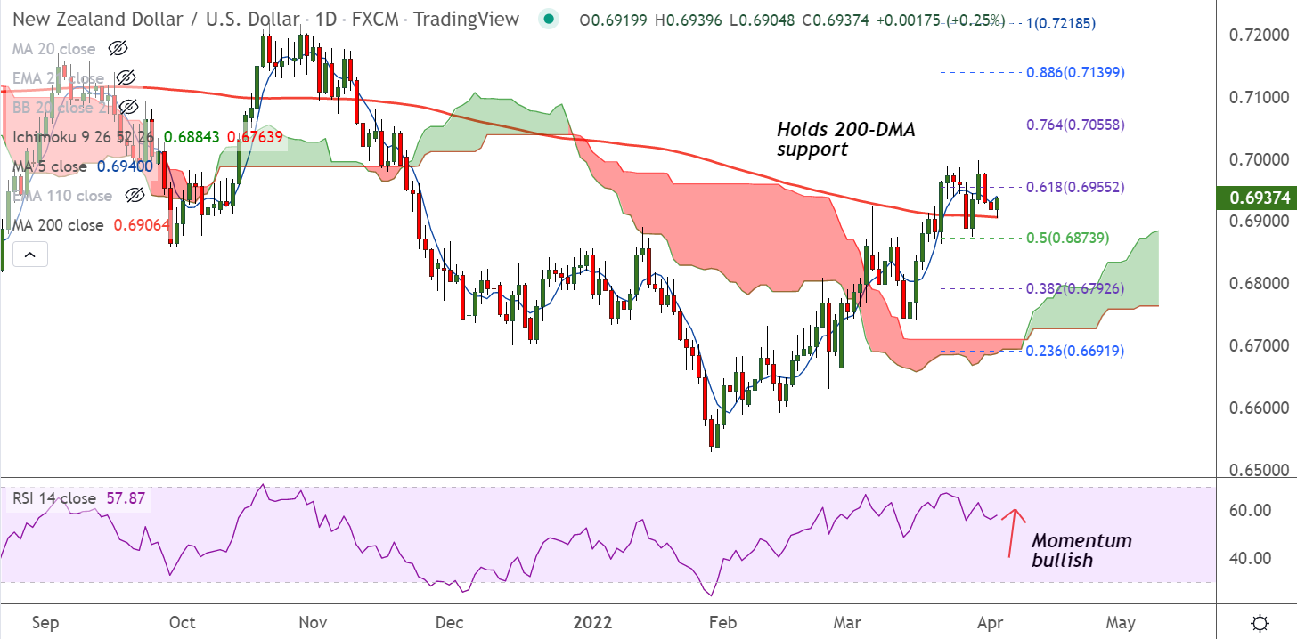 Summary: NZD/USD finds major support at 200-DMA, any weakness only on break below. Technical bias supports gains in the pair. Resumption of upside will see test of 0.70 level.