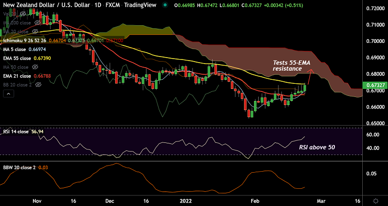 Summary: NZD/USD trades with a bullish bias. Watch out for decisive break above 55-EMA for further gains.