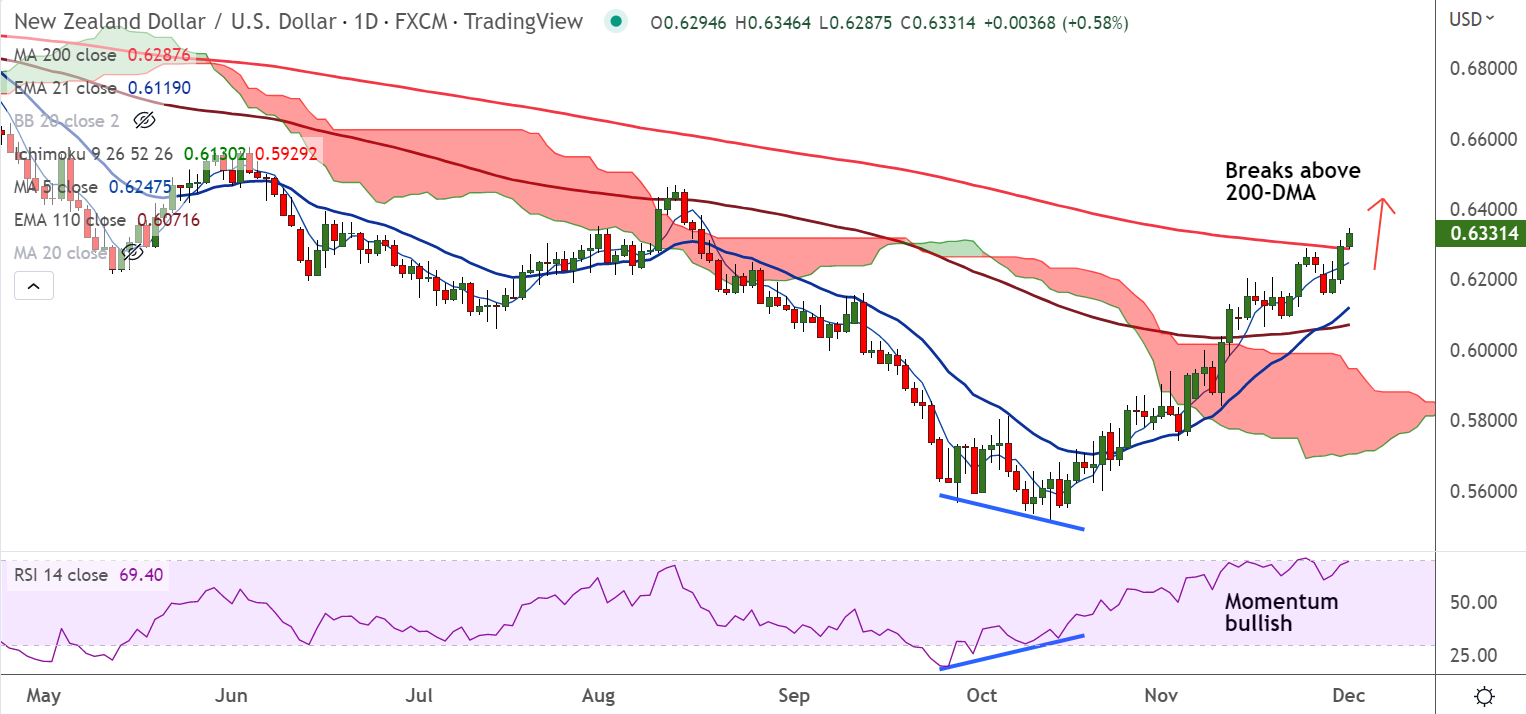 Summary: NZD/USD trades with a bullish bias. Close above 200-DMA will aid further upside in the pair.